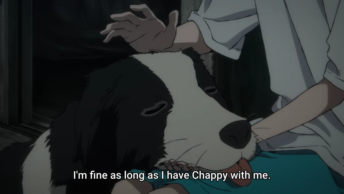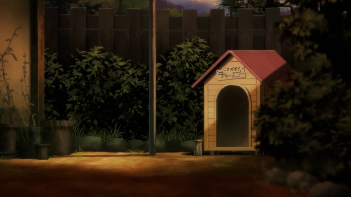 This whole sentence is about Chappy, but for the second part of it, they dramatically switch to showing Shizuka. I think this is once again a reference to her hanging herself? I am not entirely sure if I got this one right, so I'll try to pay more attention to how they use the sudden gust of wind effect.