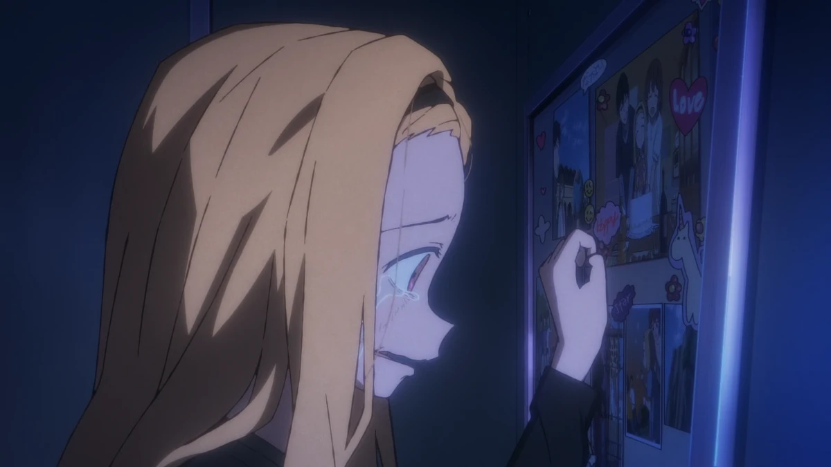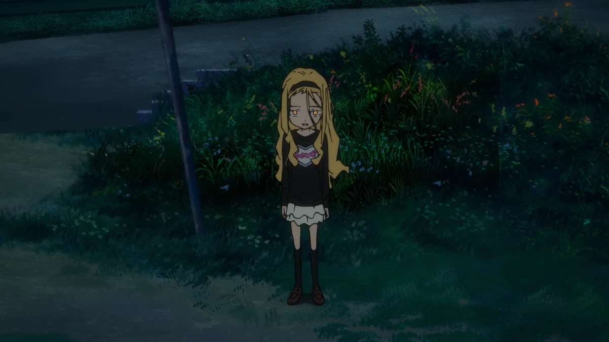 And then the cross hits you, because for the first time you see the kanji that are written on her backpack (death, garbage, ... etc). This show is so awesome, because all of the real "haymakers" are in the quiet moments, like this one.